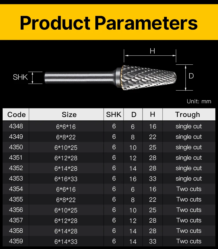 | Application | Widely used for metalwork, tool making, model engineering, wood carving, jewelry making, welding, chamfering, casting, deburring, grinding, cylinder head porting and sculpting. It can freely cut various metals (including hardened steel) and non-metallic materials (such as marble, jade, bone) below HRC65. It can replace the small wheel with handle in most of the work, and no dust pollution. The processing quality is good and the finish is high, and it can be processed into high-precision mold cavities of various shapes. It has a long service life and is ten times more durable than high-speed steel tools and more than 200 times more durable than alumina grinding wheels. |