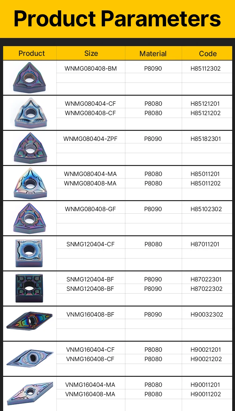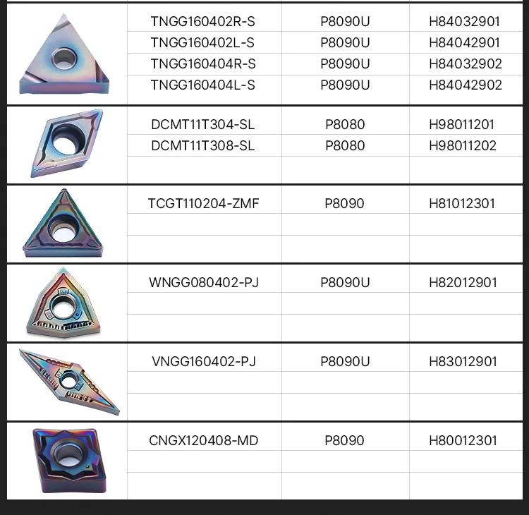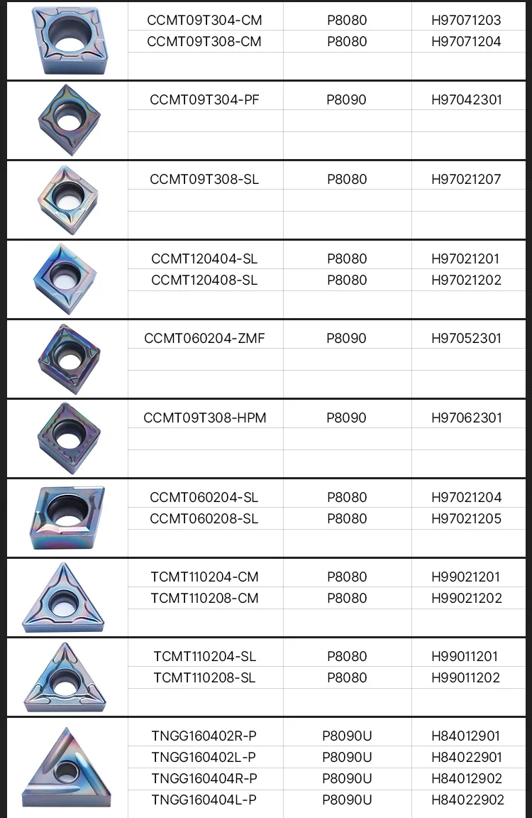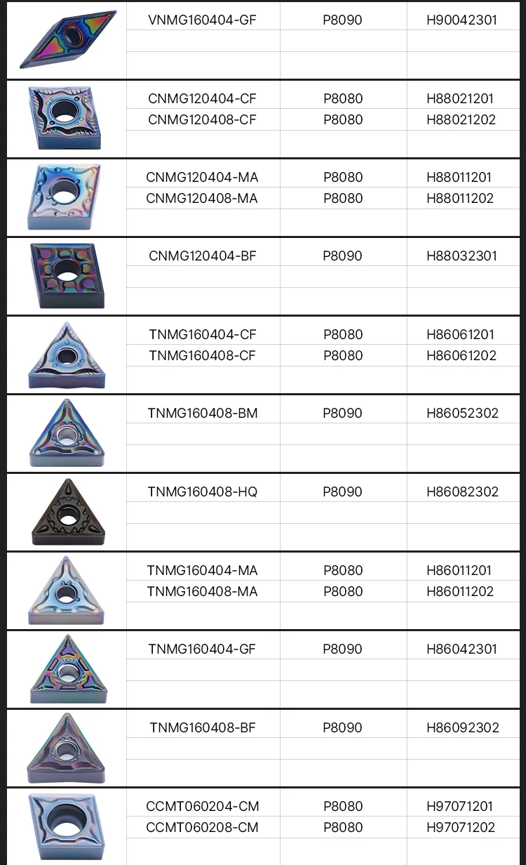 | Model | WNMG SNMG VNMG CNMG TNMG CCMT TCMT TNGG DCMT TCGT WNGG CNGX |